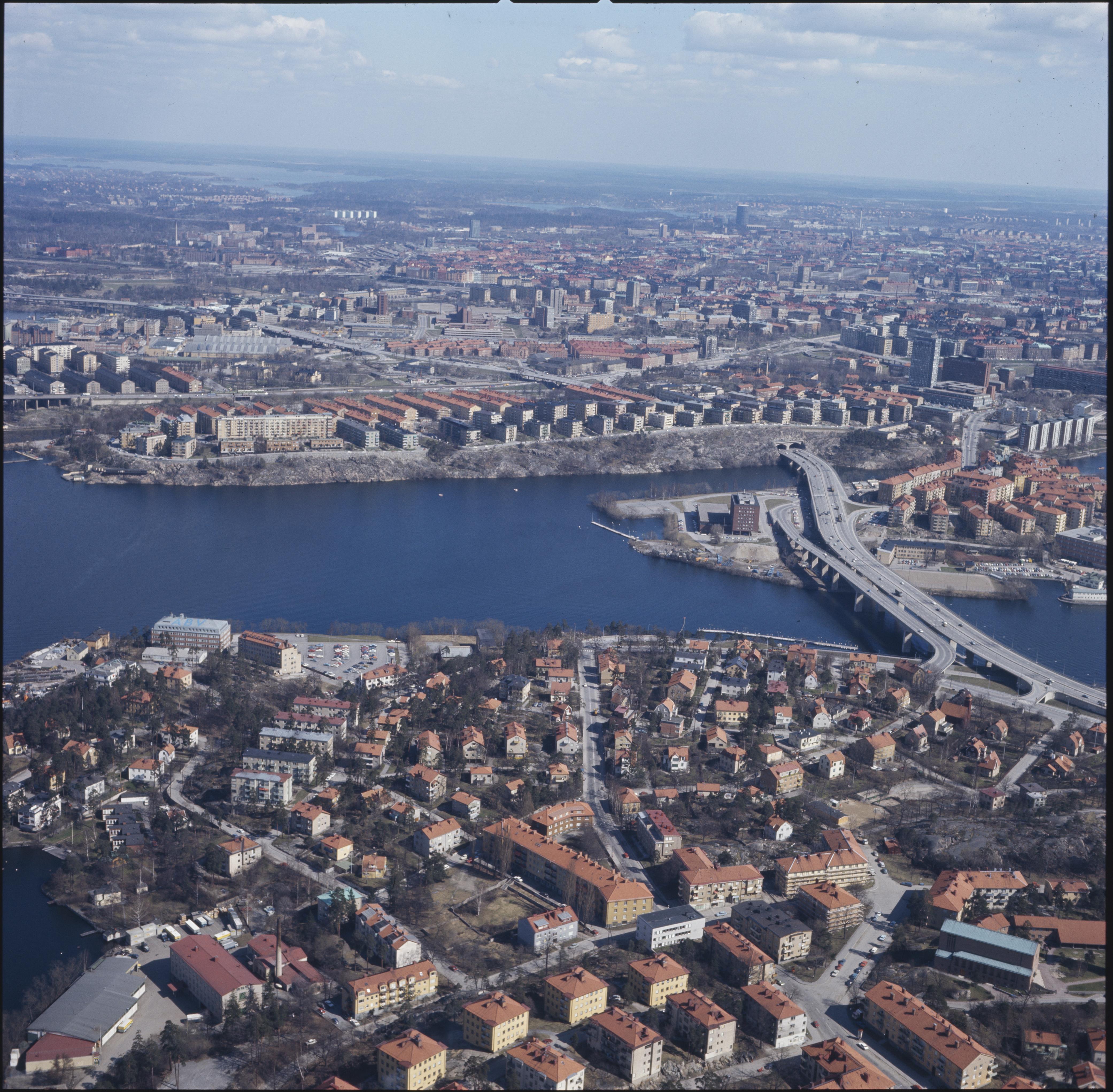 Essingebron och Essingeöarna. I bakgrunden Fredhäll.