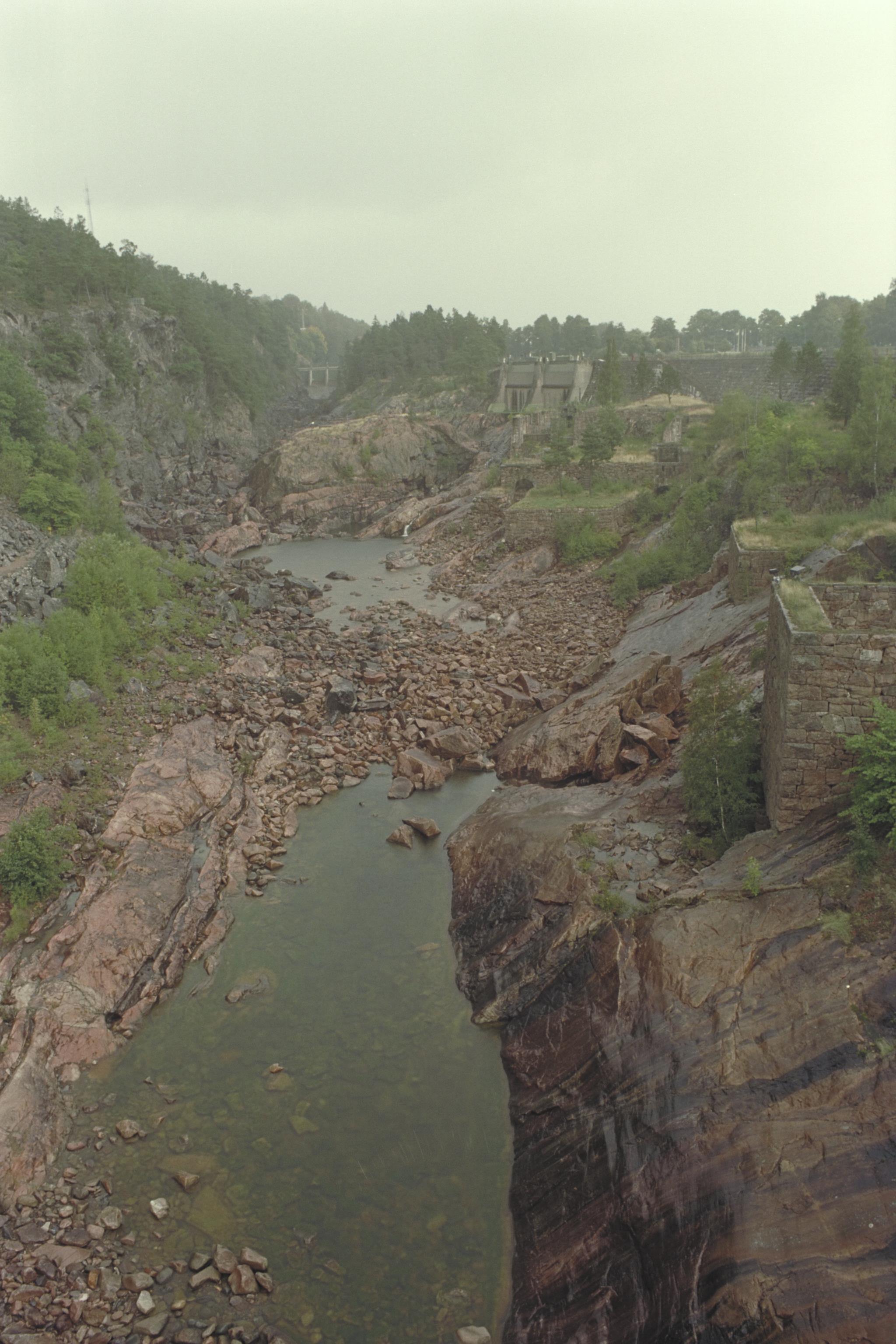Bild över den torrlagda Trollhättefallen, tagen från Oscarsbron.