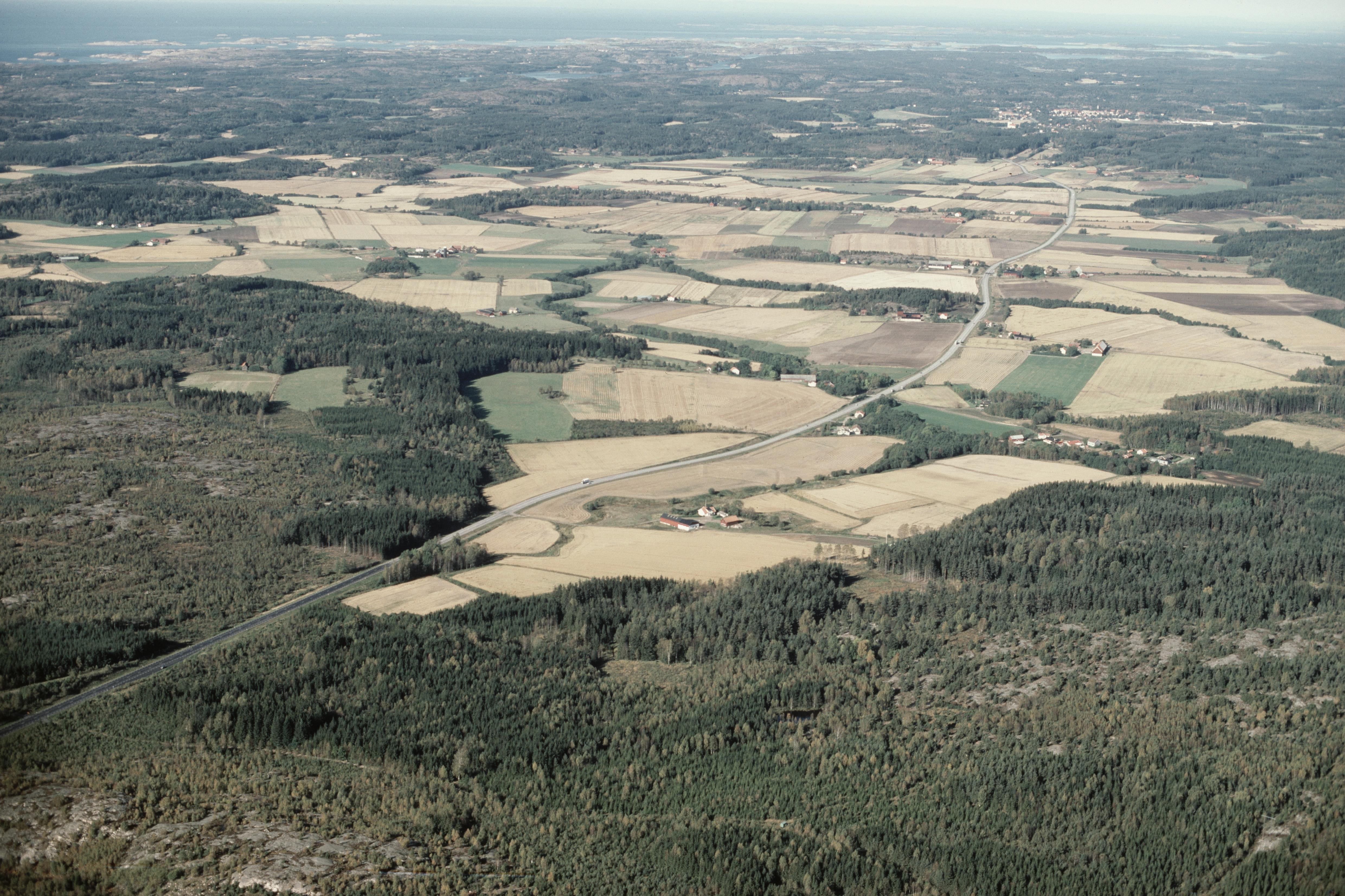 Tanumsslätten. Hällristningsområde i fornlämningsrik dalgångsbygd. Tegneby, Aspeberget, Kyrkoryk, Nedre Ljungby, Ljungbytorp, Gerum m.m. i bildens övre del. Boplats RAÄnr Tanum 1283:1 m.fl. vid bildens mitt. Bilden är tagen mot (väderstreck): NV