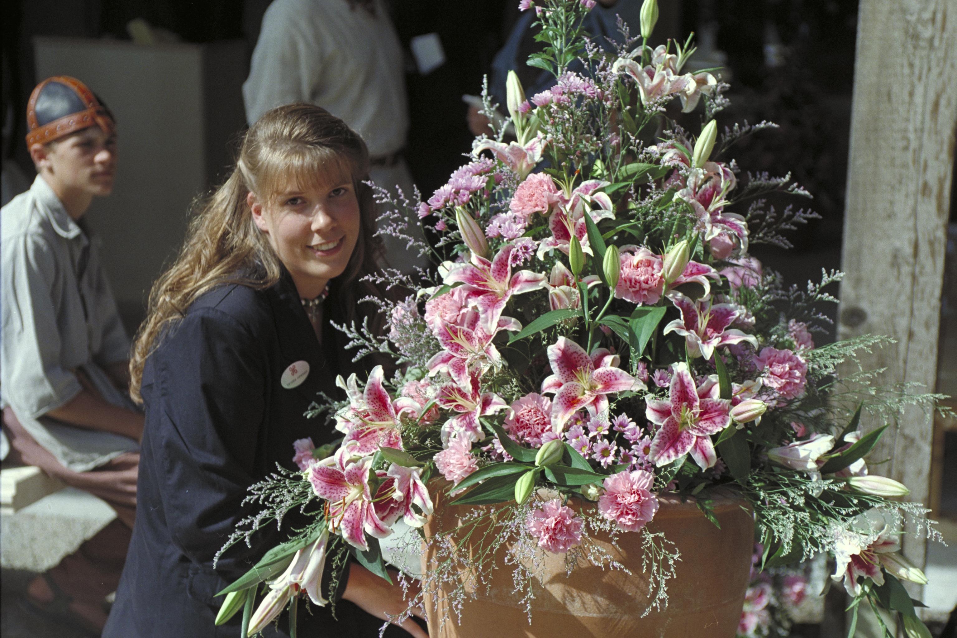 Invigningen av Birkamuseet. Kvinna med blomsterarrangemang