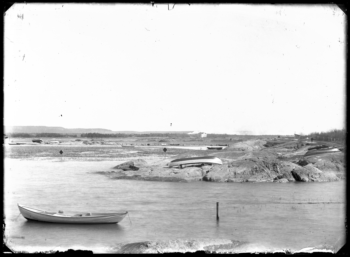 I framkant Midsommarviken, vidare ses Länsan. I fonden det gamla fattighuset och rök från industrierna i Vargön. Troligtvis är det också skyttepaviljongen som kan anas i bakgrunden.