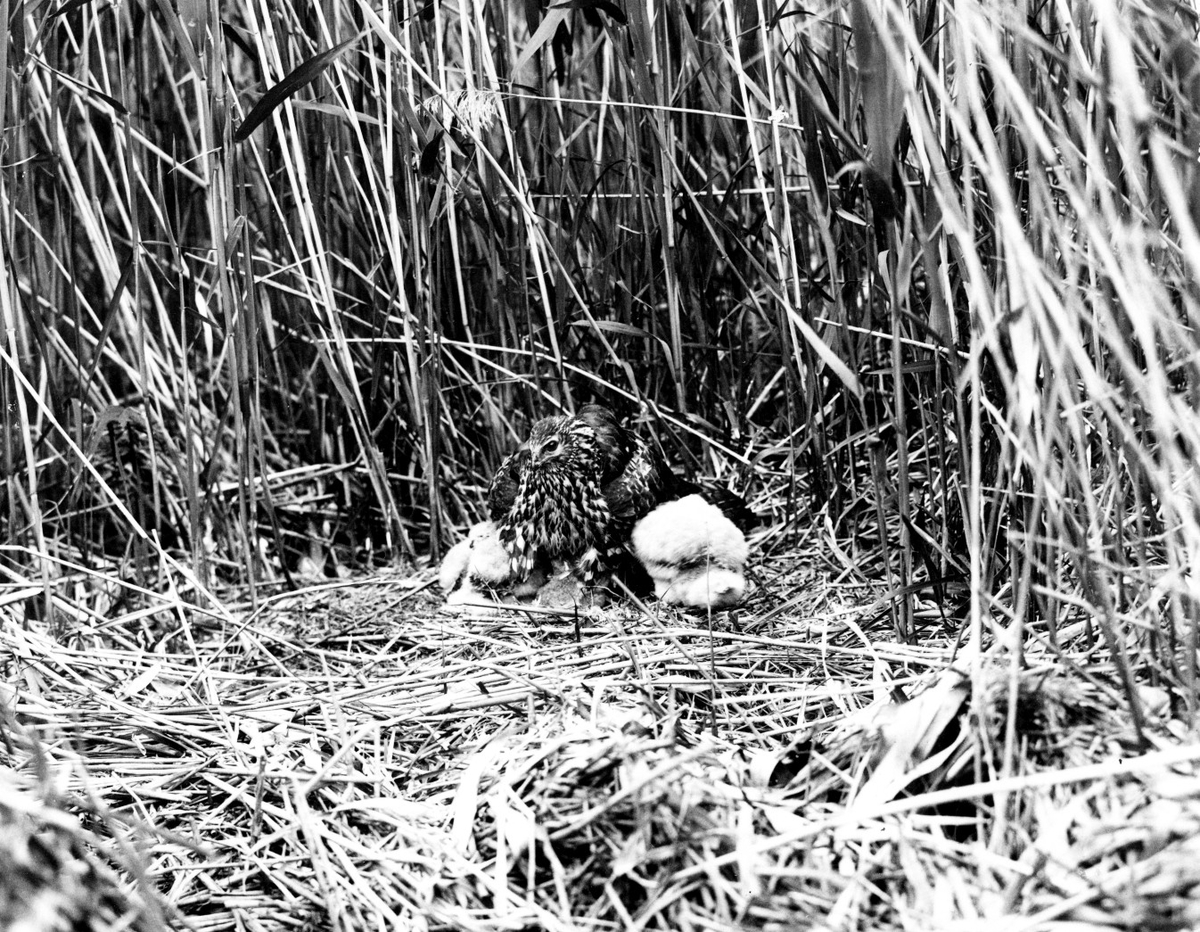 Blå kärrhökhona (Circus cyaneus) skyler sina ungar under regn.