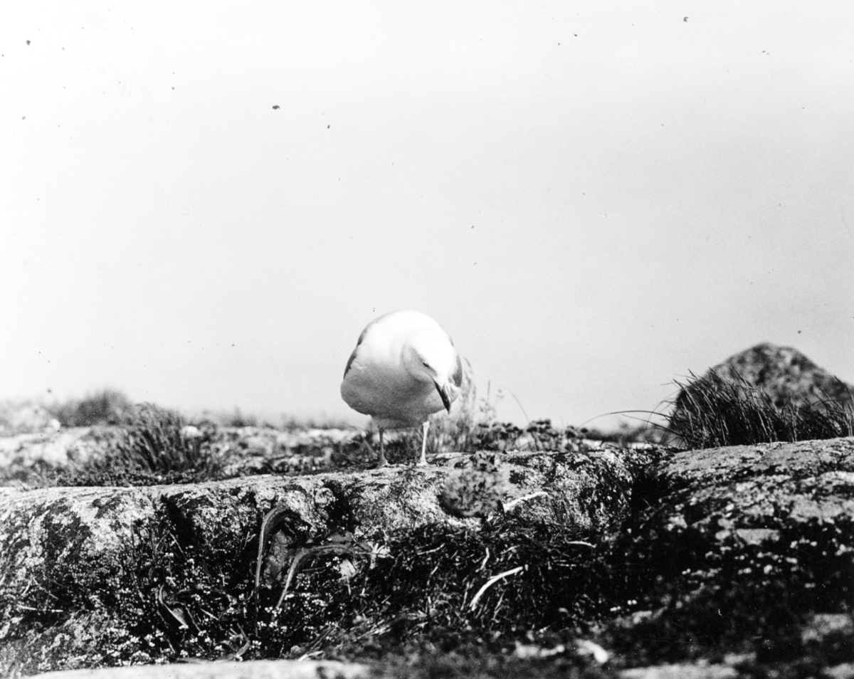 Gråtrut, Larus Argentatus, ser ner på en unge