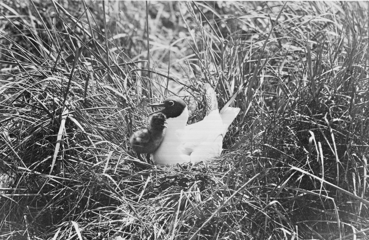 Skrattmås (Larus Rdibúndus) i bo med unge.