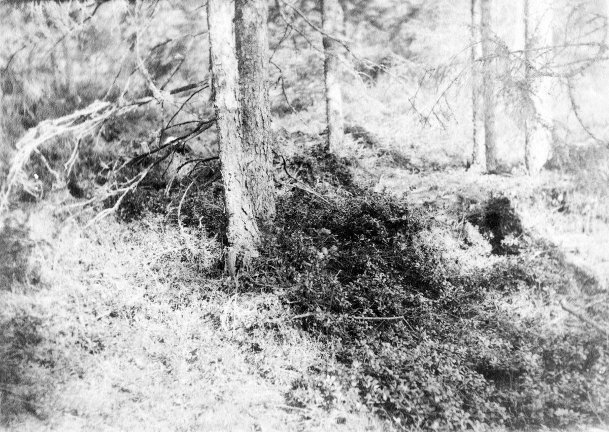 Fågelbo med ägg av Tjäder (Tetrao urogallus) framför trädet till höger. 19 Juni 1909