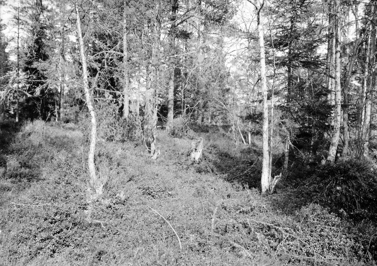 Boplats för Tofsmes, Parus cristatus, 12 Maj 1911. Boet i trädstubben mitt i bilden.