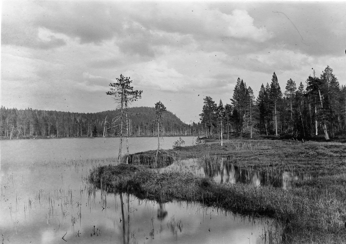 Biotop för smålom på spetsar av de långa stående tallarna mitt för tecknet x Bergtjära nedanför s.v sidan av Fiskåfjället, Klumpvattnet, Jämtland Edv. Wibeck 28/6 1923