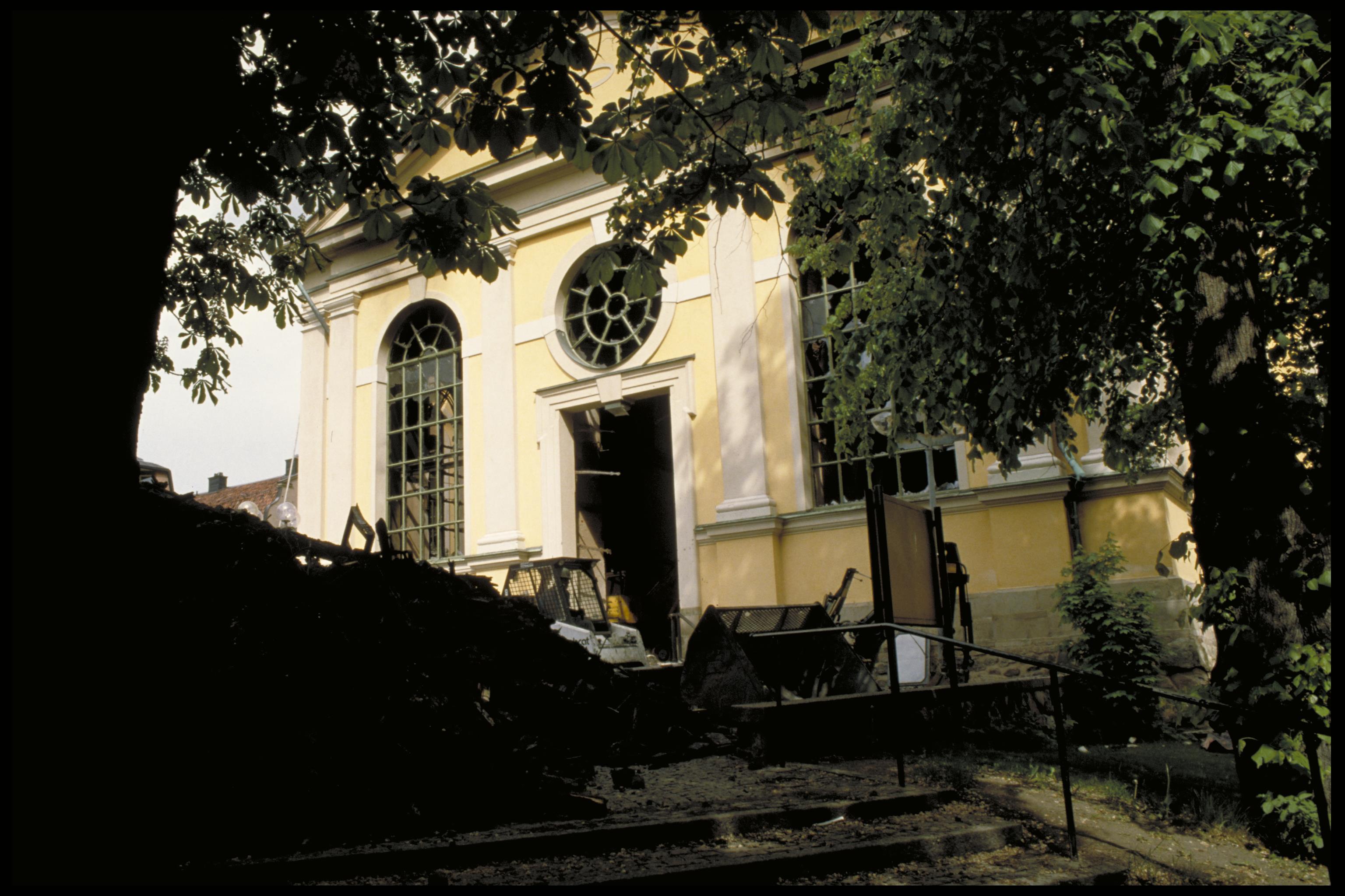 Beskrivning: Resterna av Katarina kyrka efter branden den 17 maj 1990.