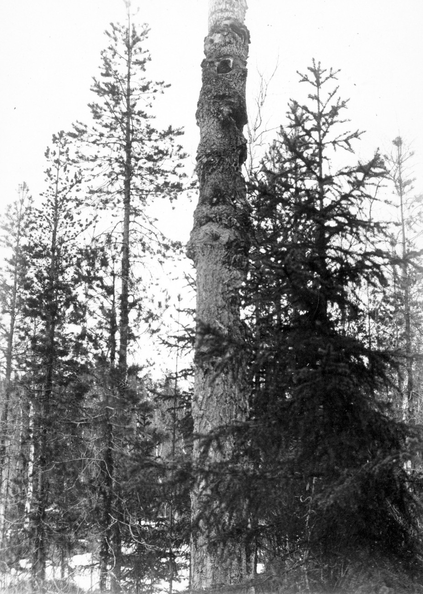 Boplats för pärlggla, Aegolius funereus (text i blått som jag inte kan tyda) Tullus, Nälden 22/4 1923 Foto N. Nilsson