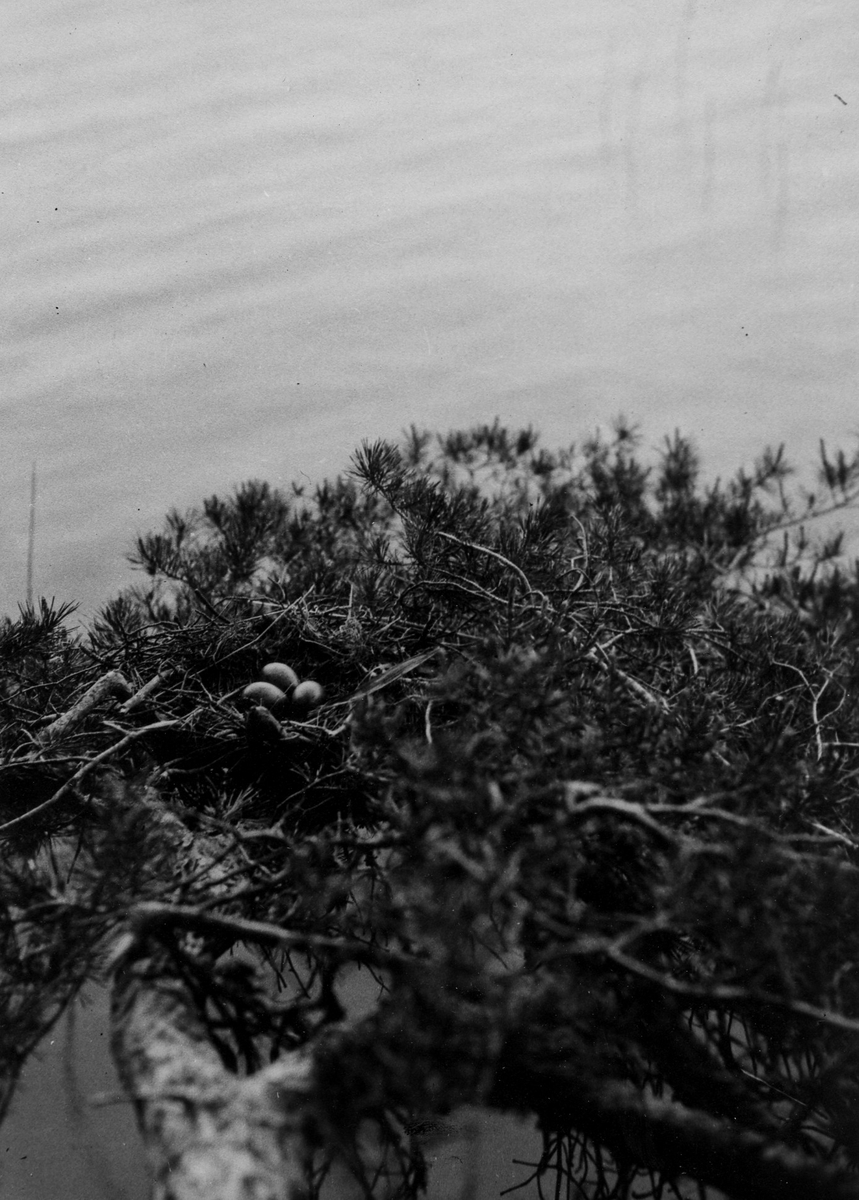 Fiskmåsbo på tallgren Båven nära sparreholm 28/6 1928. Foto Björn ? Boet var beläget 3 ,1/2m över vattnet, och byggt av måsen själv, ej gammalt bo av annan art. Paret häckade där flera år, och ett år fanns boet på en annan, närliggande holme, även då beläget i en tall, och på liknande sätt, ute på en gren över vattnet. Även i detta fall var boet byggt av måsarna själva.