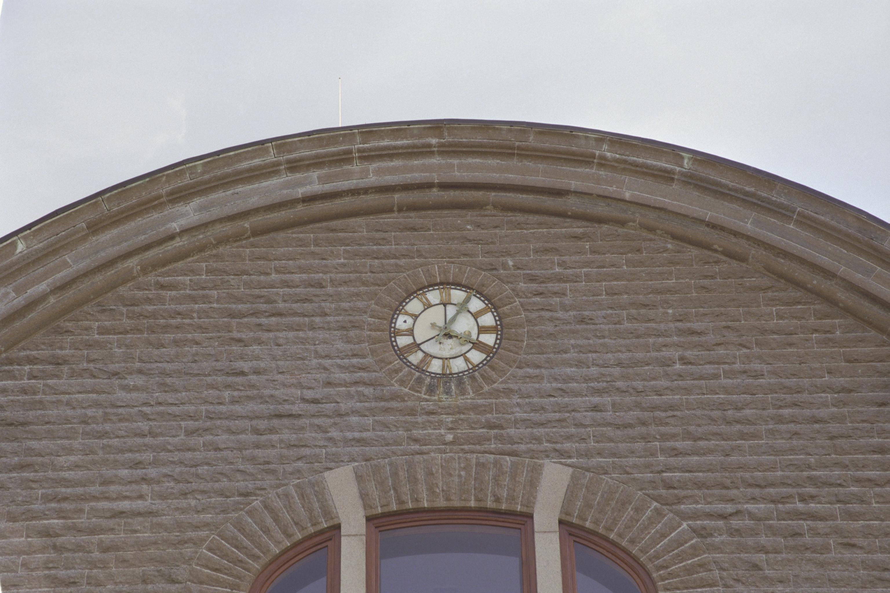 Slottets norra fasad, huvudfasaden. Mittrisalitens övre del, klockan