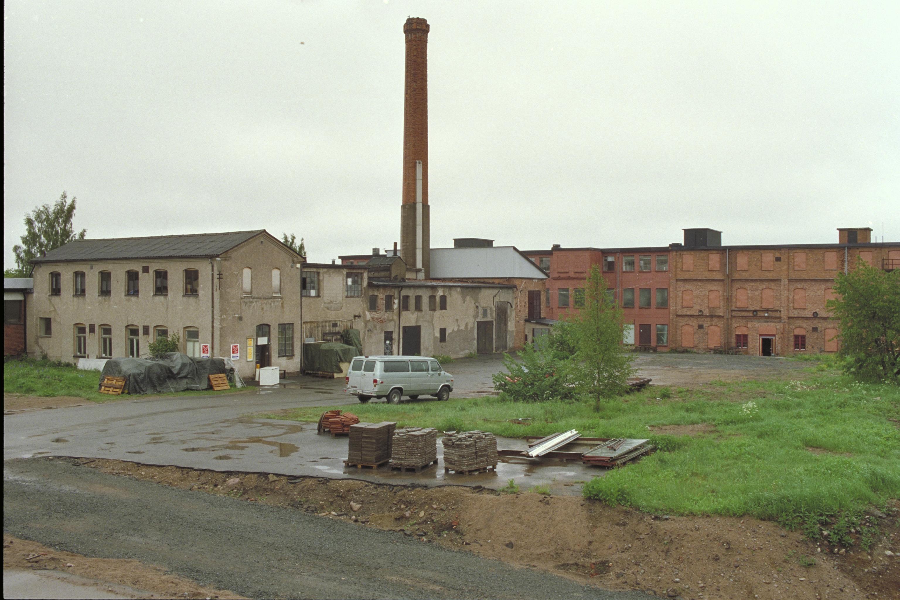 Den nedlagda fabrikens lokaler med åttkantig skorsten och bakgård.