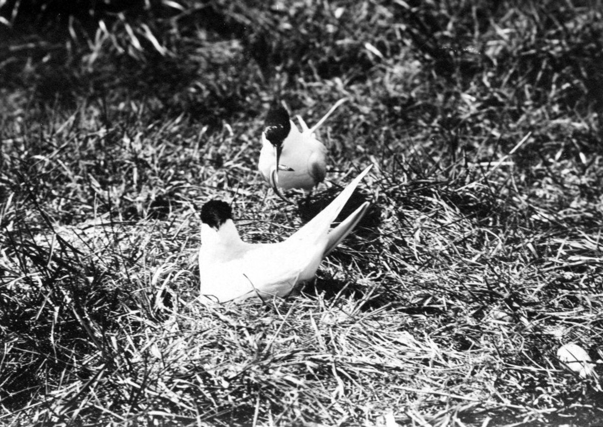 Ett par av Kentska tärnan, Sterna cantiaca. Hanfågeln ger fisk åt honan