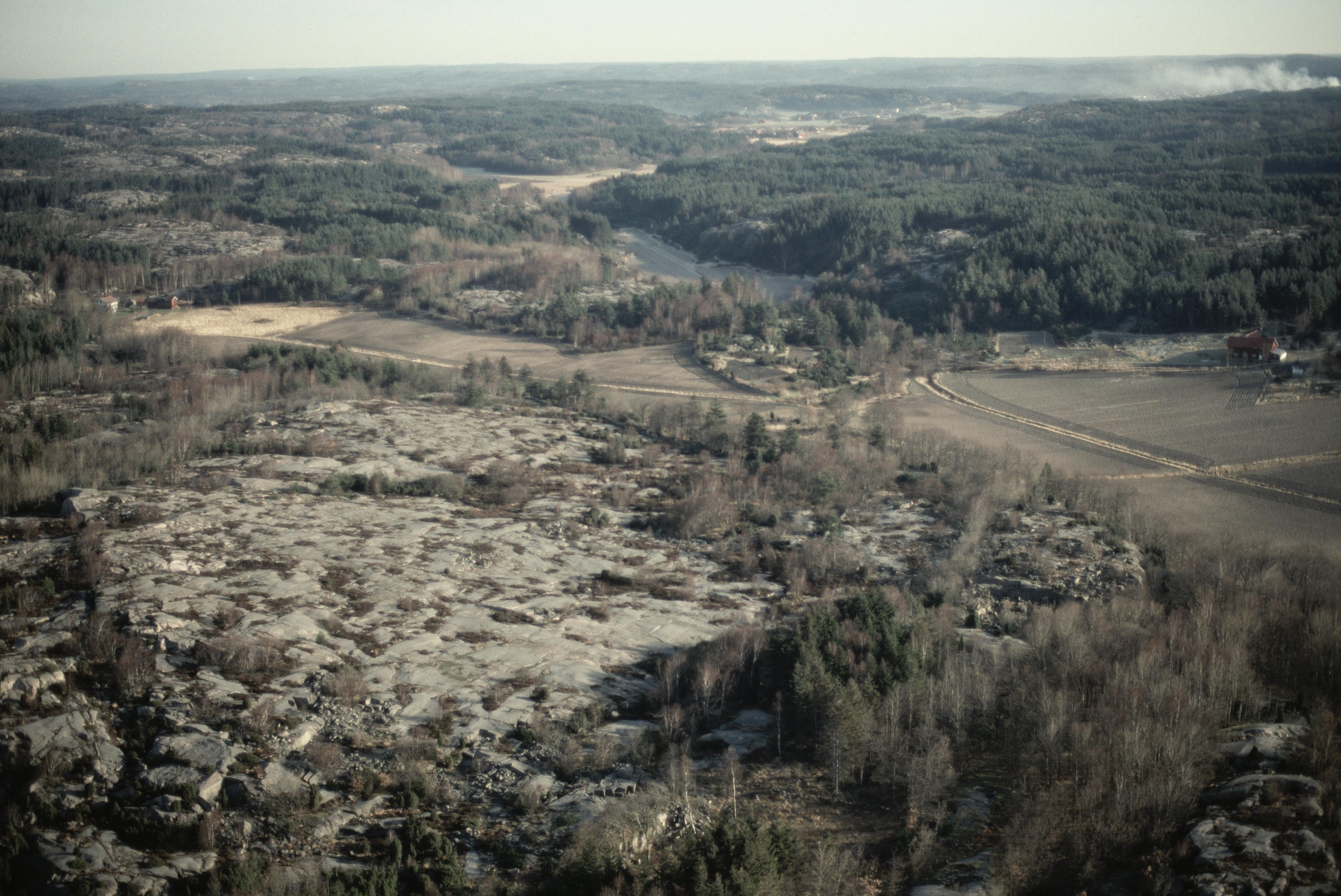 Hällristning RAÄnr Svenneby 8:1 vid bildens mitt. I bildens övre del Södra Ödsmål i Kville socken. Bilden är tagen mot (väderstreck): S