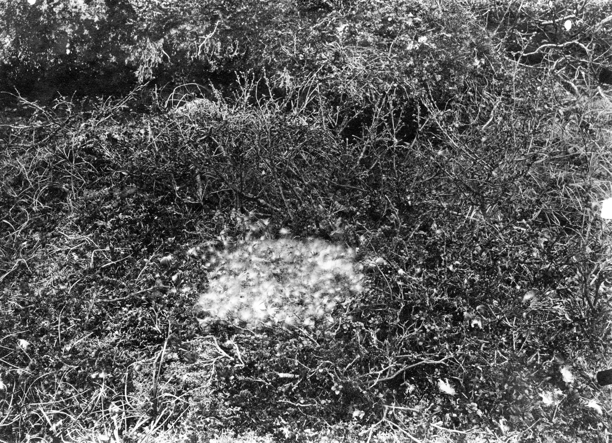Bo av Fjällgås (Anser erythropus) i det skick det befann sig vid upptäckten.Äggen helt övertäckta av dun. 23 Juni 1918.