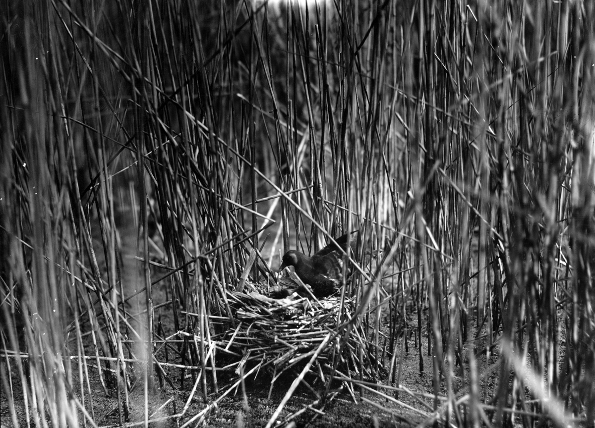 Rörhöna (Gallinula c. chlóropus) lägger sig i boet.