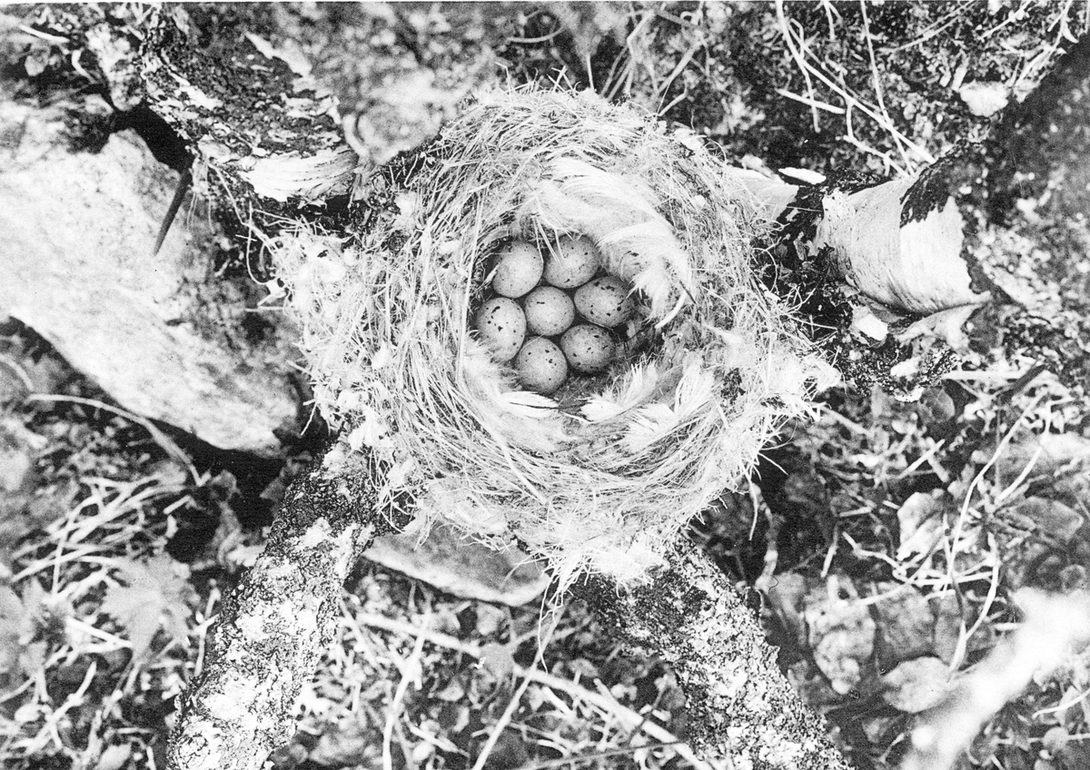 Fågelbo Bergfink, Fringilla montifringilla (i träd) 28 juni 1904