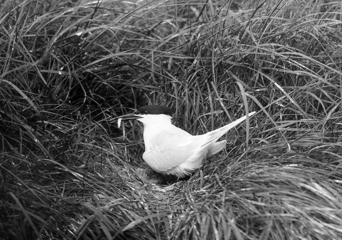 Kentsk tärna (Sterna cantiaca) har kommit med en fisk till den nykläckta ungen.