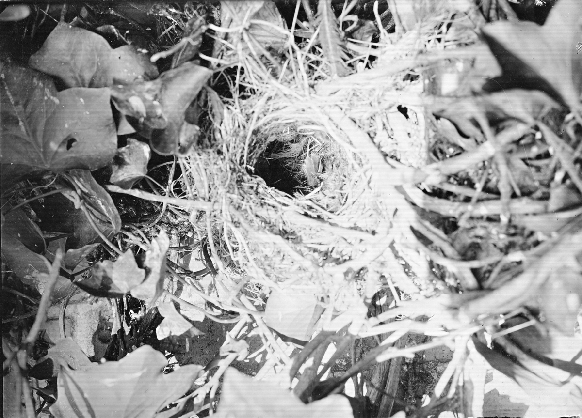 Boplats för gråsparv, Passer domesticus.Boet i murgröne-spaljen 20 augusti 1921
