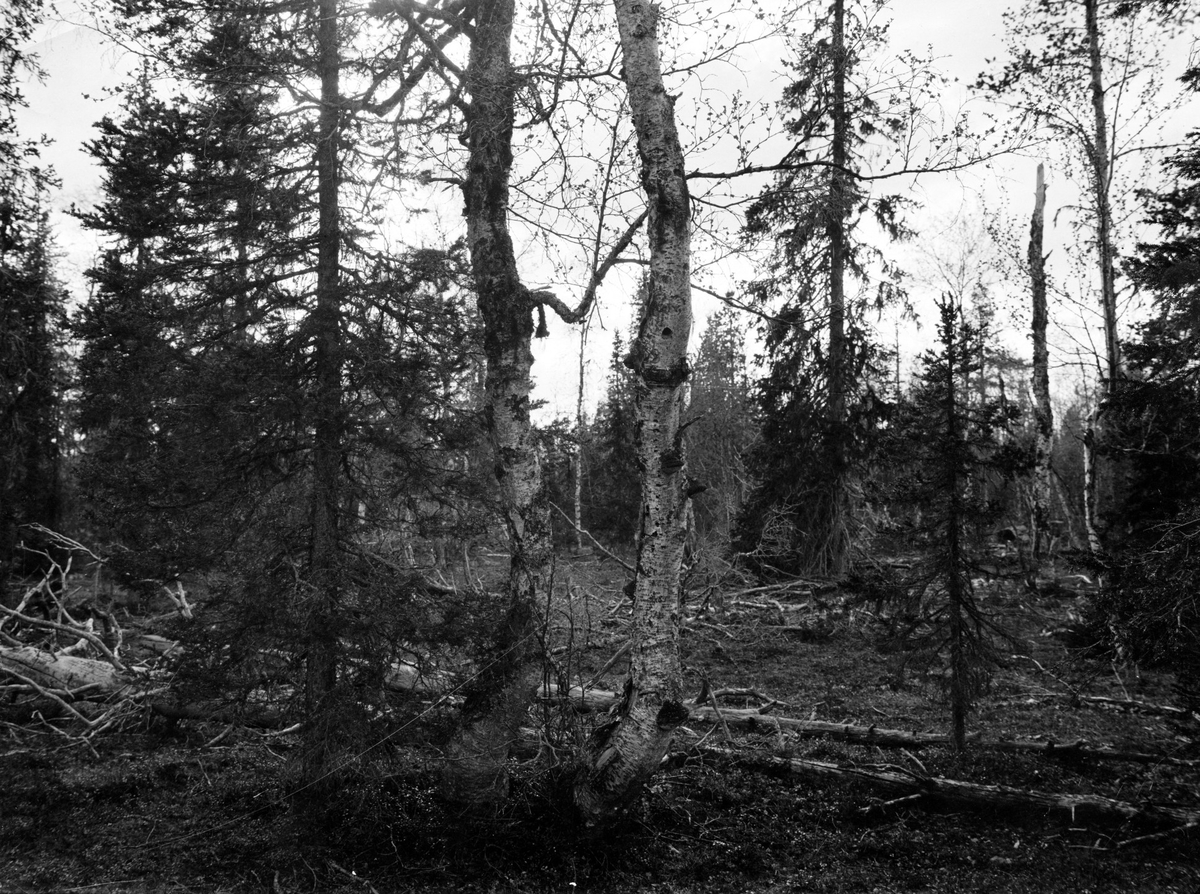 Biotop och boplats Lappmes, Parus lapponicus, 29 Juni 1909. Bohål i björken mitt i bilden