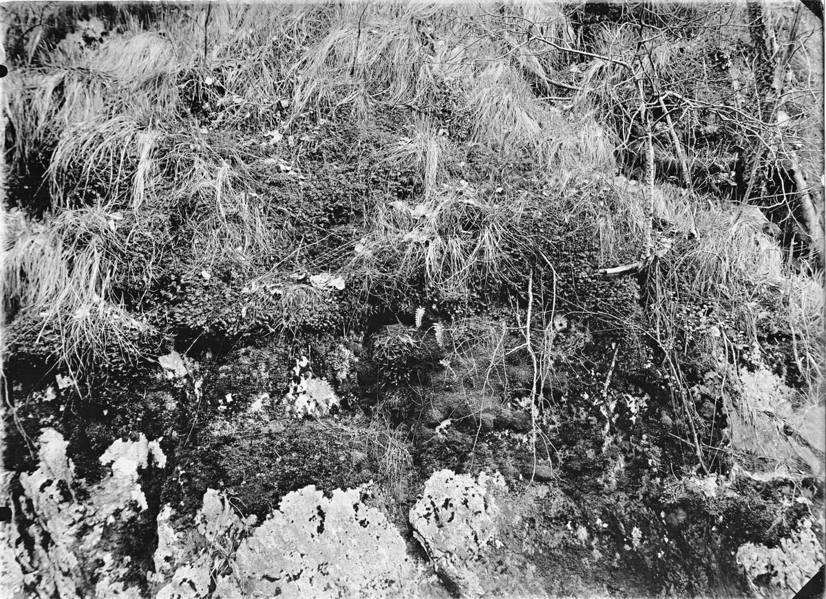 Boplats för bergärla = gråärla Motacilla baorula 11 maj 1937. Boet mitt i bilden till vänster om de 2 små orbunksbladen