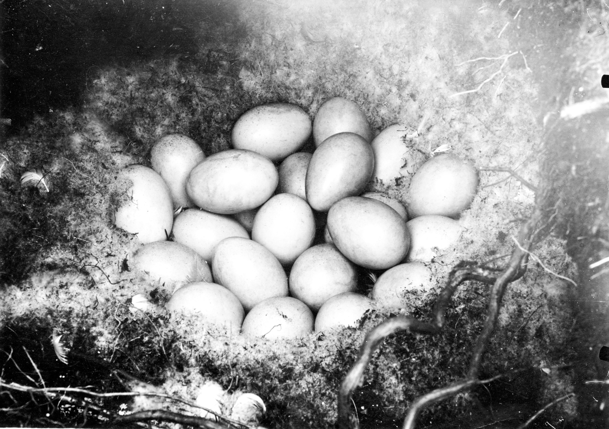 Bo av Storskrake (Mergus merganser) i en gammal rotvälta av en tall nära toppen av ön Skötröka i sydändan av fjällungs skärgård i Stockholms län 24 maj 1937.