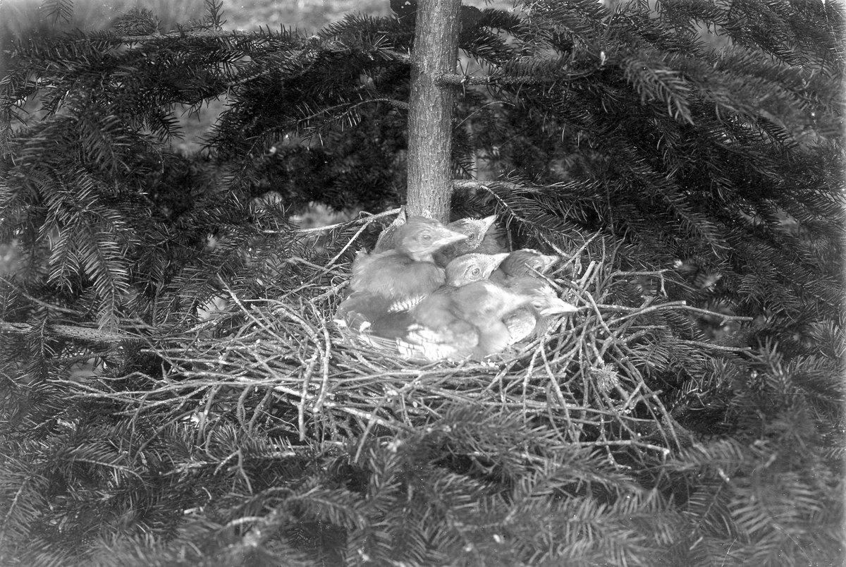 Fågelbo med ungar, Nötskrika, Gárrulus g.glandárius. Fotograferat den 8 Juni1906