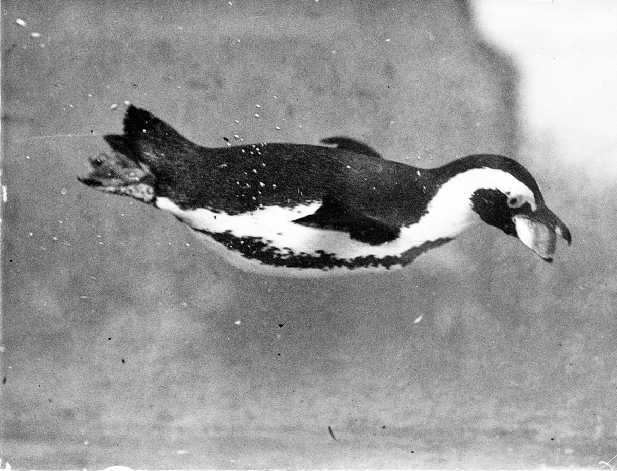 nature´s streamline Sleek body vutting trhough the water, A Rock Hopper Penguin turns toward the surface with its prize after a deep dive för a fish at hte penguins´s Pool in The London Zoo. An ungainly bird on land, the penguin becomes one of Nature´s most graceful creatures beneath the water. It is one of the best and fastest o swimmers, beak, head and body streamlined to present loast resistance to the water. CALC Feruary 10th 1937
