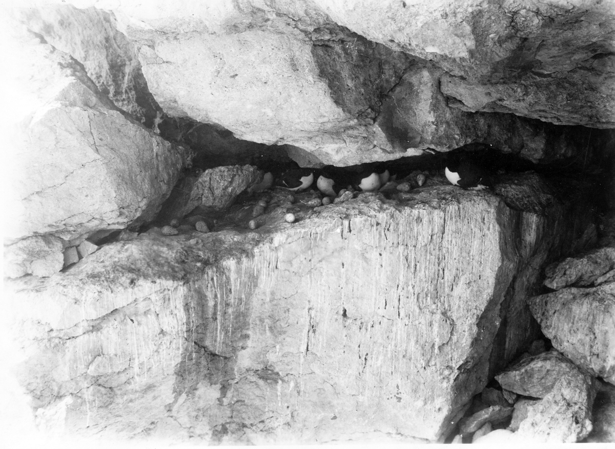 Sillgrisslor (Uria troile) med ägg i bergskrevan.