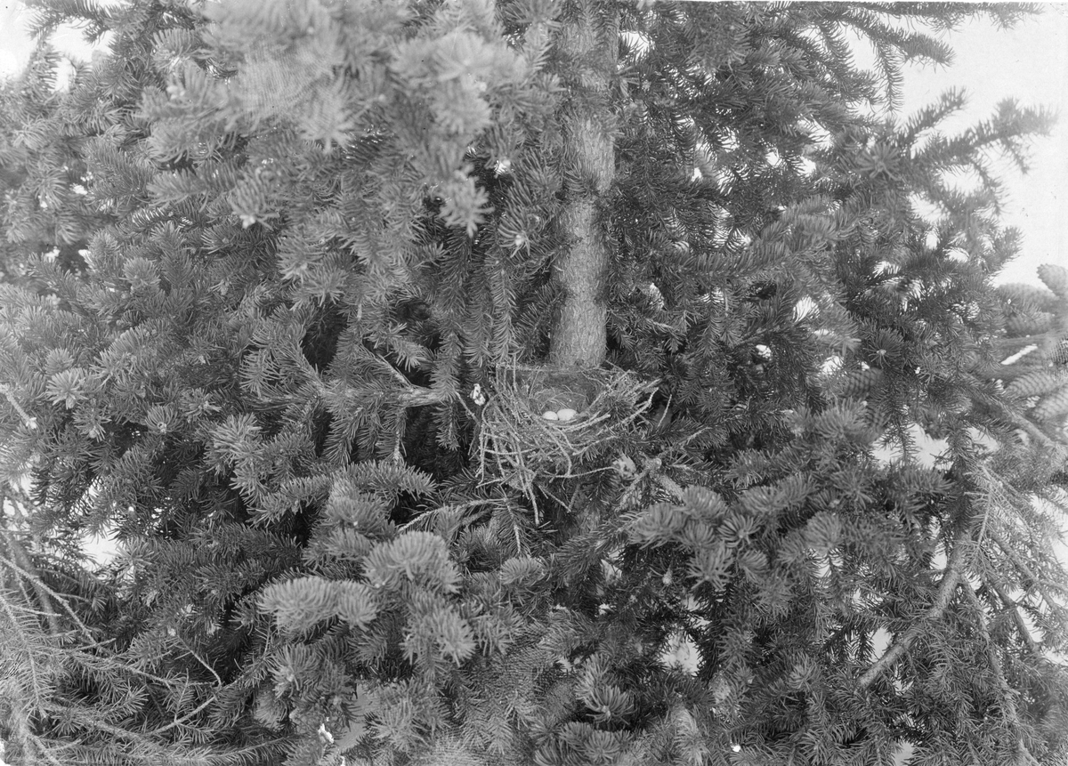 Fågelbo för Mindre Korsnäbb, Loxia curvirostra, Boet högt uppe i granen som pilen pekar på. 7 Feb 1914