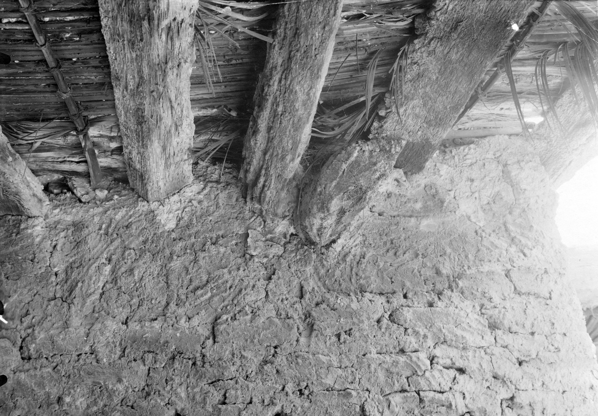 Plats för bo av (Emberiga sahare?) (mellan de två takbjälkarna till höger) El Kantara, Algeriet