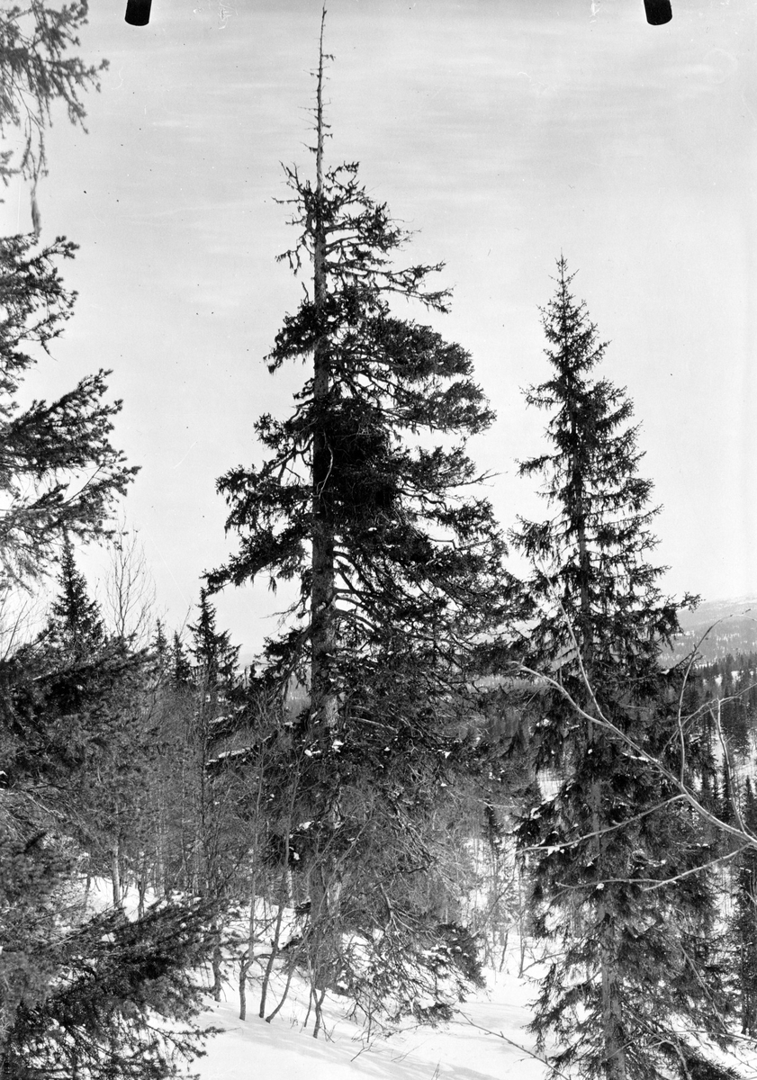 Aquila chrysaetos, kungsörnsbo i gammal gran växande i sydsluttning (glest beväxt med gran och björk) å förberg något ö. om V:a Åderklumpen, Murfjällstrakten Skattefjäll Hotagen s:n Jämtland Boets öfre kant befinner sig ca 13 m ofan marken. I bakgrunden af bilden skymtar Stenfjället fram Foto E. Wibeck den 1 april 1921