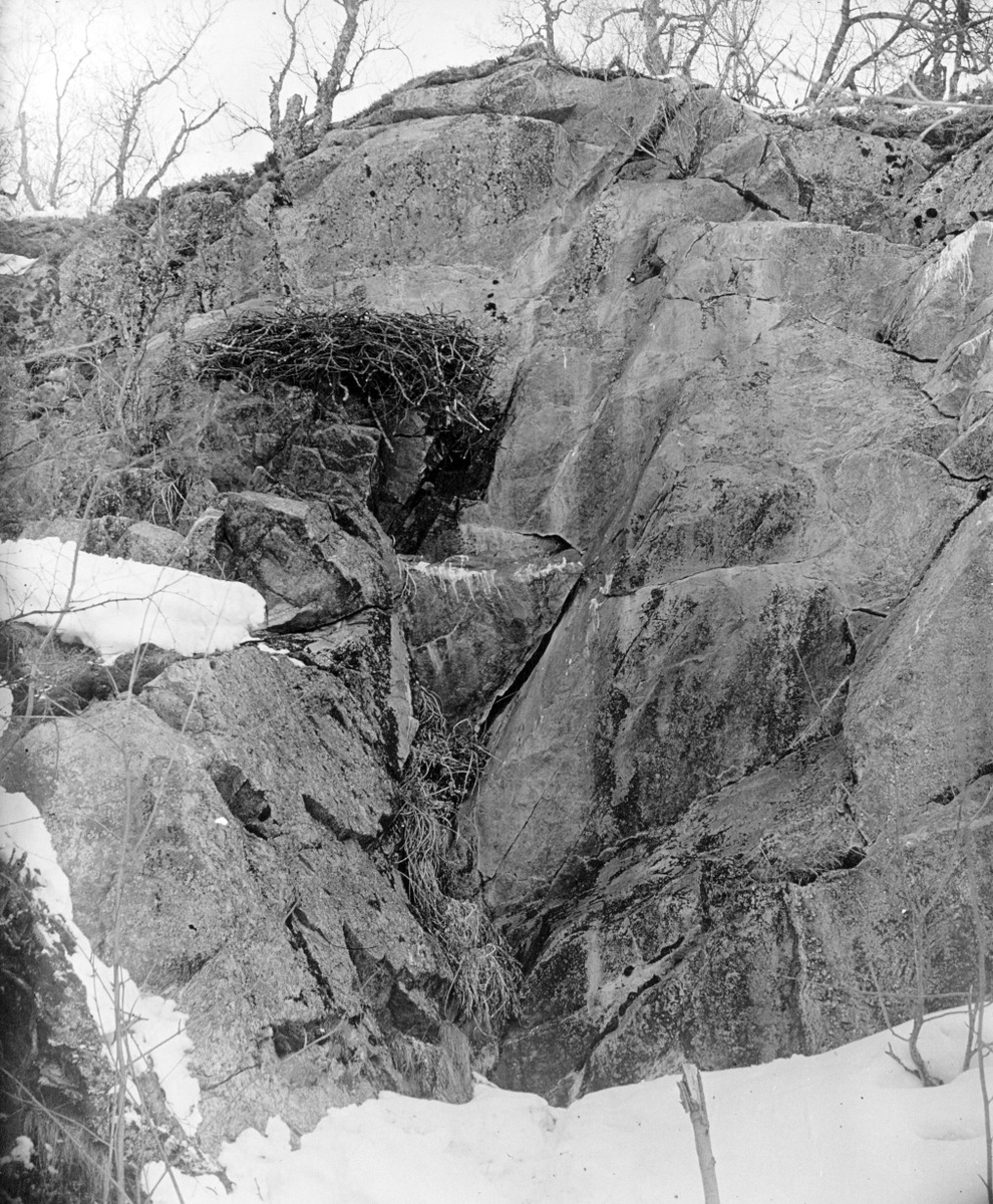 Boplats för jaktfalk, Falco rusticolus Själva hyllan där boet var beläget, är markerat med det vågräta strecket, tvärstrecket= själva boet