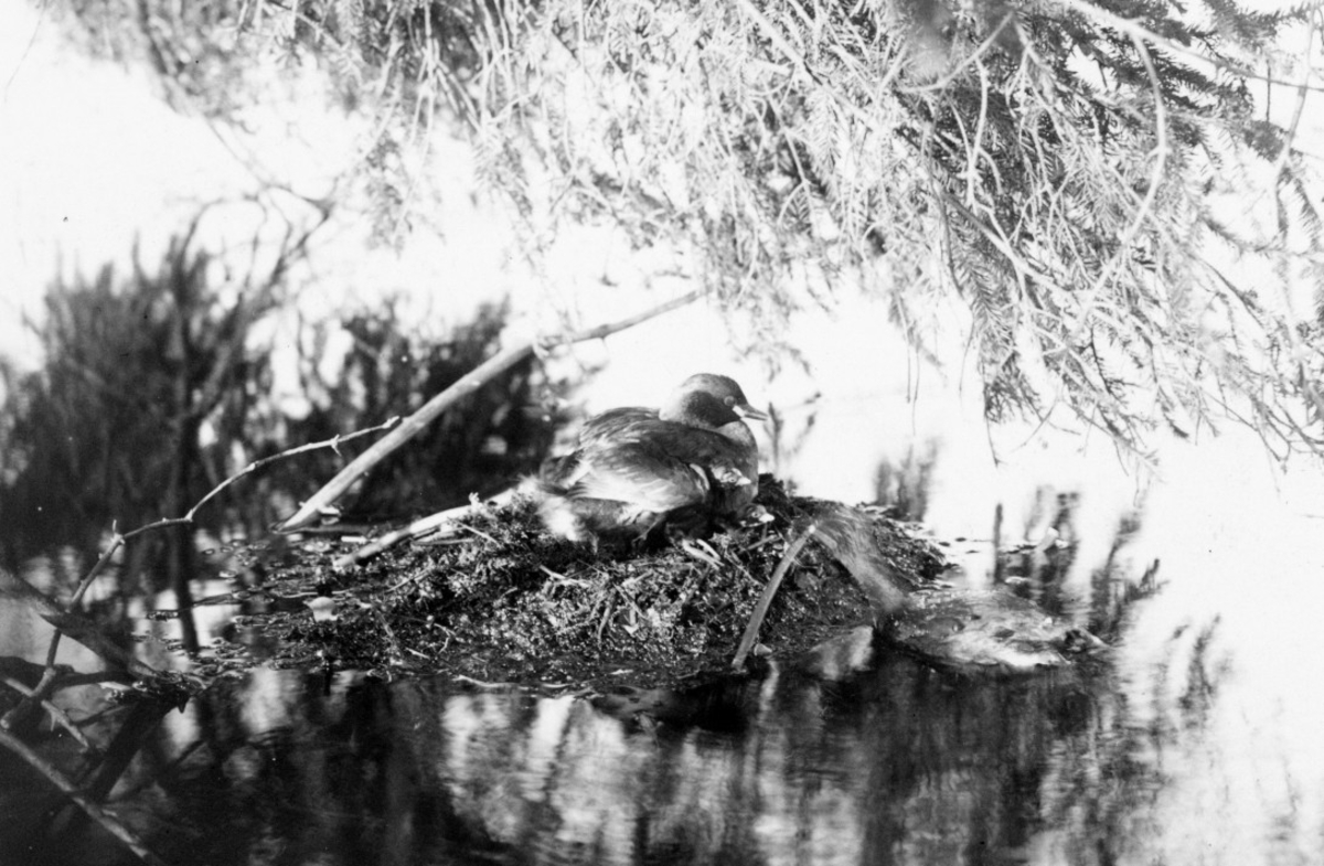 Podiceps minor, smådopping i boet. Två ungar sticker fram huvudet för att få mat av fadern som sträcker fram halsen mot dem. Karnavävaresjön, Skåne
