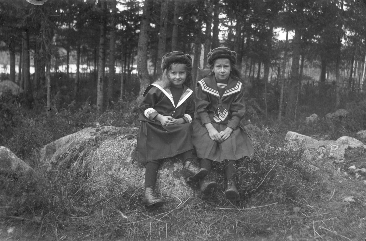 Två flickor klädda i sjömansklänningar på en sten.