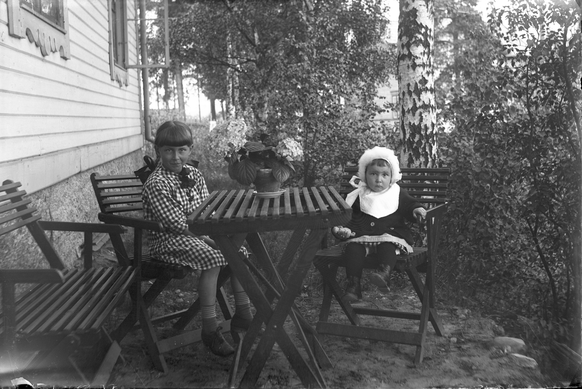 Två okända barn vid trädgårdsbord.