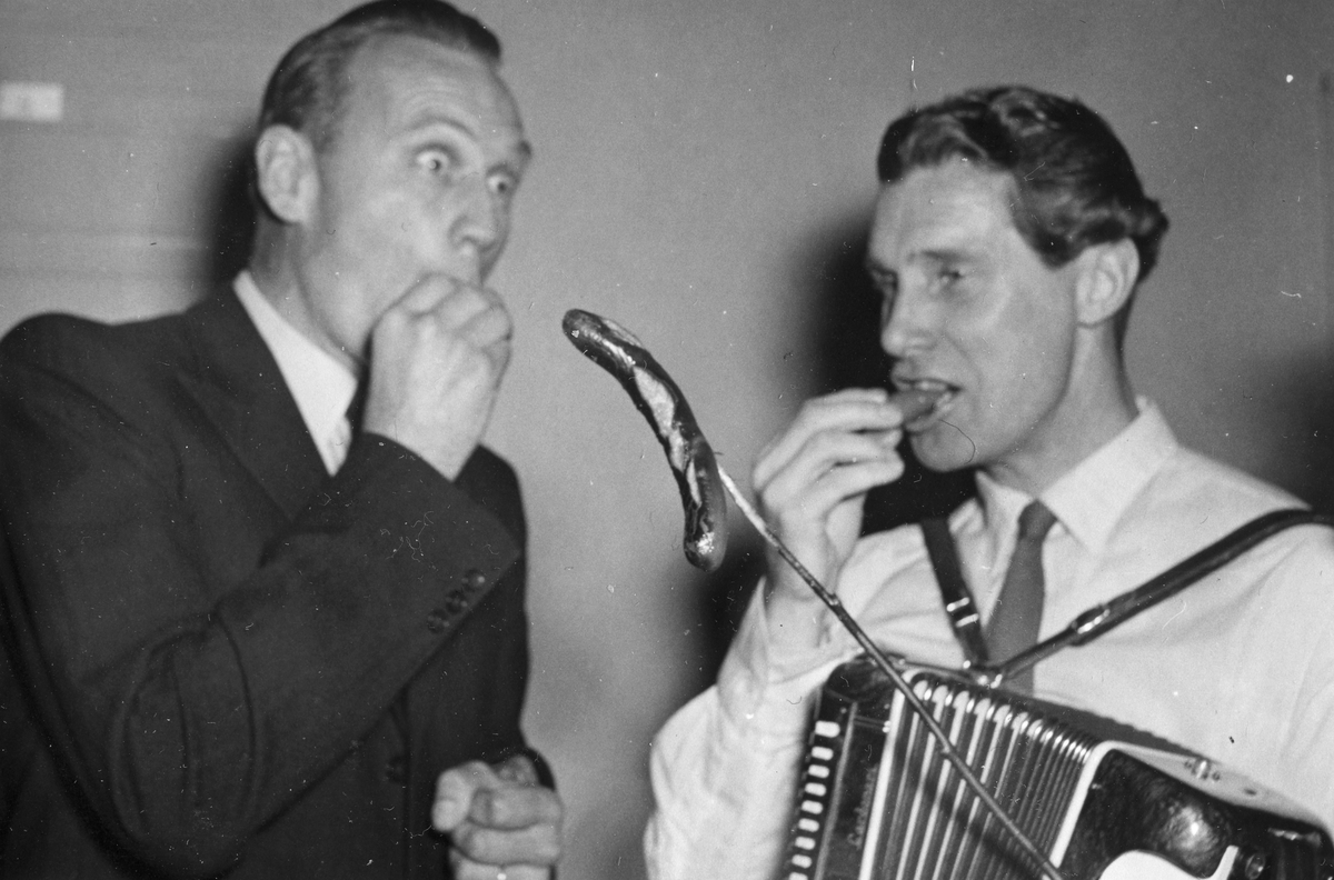 Varmkorvsätning med "musik". Bilden ingår i ett fotoalbum.