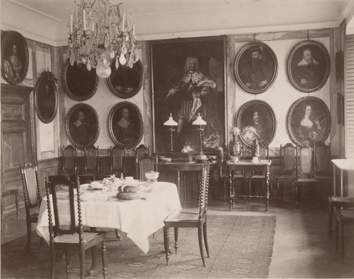Interiör med flertalet porträtt. Rettigs bostad, möjligtvis Rettigska palatset eller Villa Rettig.