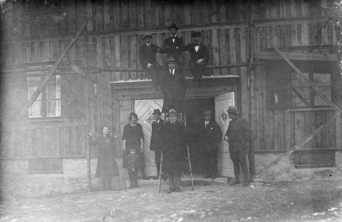 Foto från Adelsö. Grupporträtt vid porten till en träbyggnad.