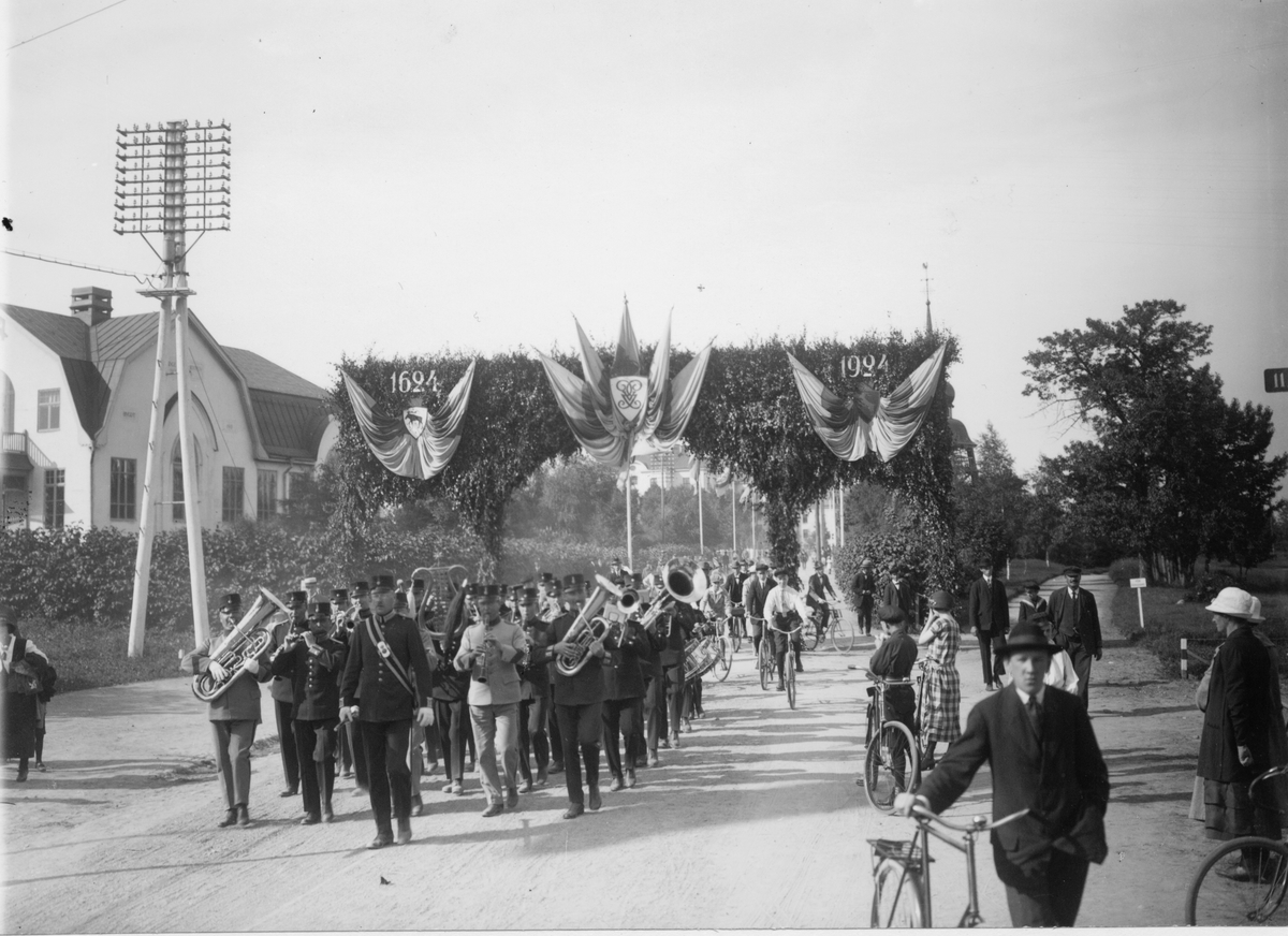 Musik och trupper paraderar genom äreporten vid kungsbäcksvägen.