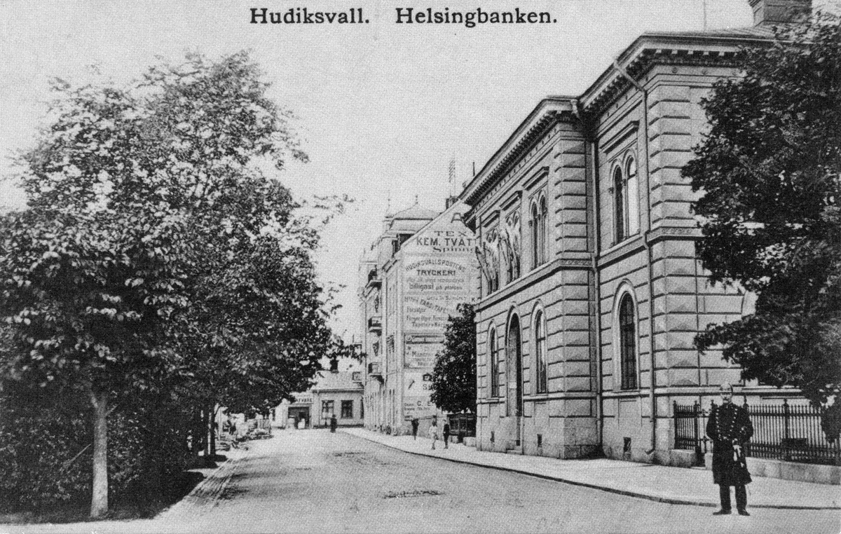 Hälsning från Hudiksvall. Sundsesplanaden med Helsingebanken. Nytryck 1988, Hälsinglands museum
