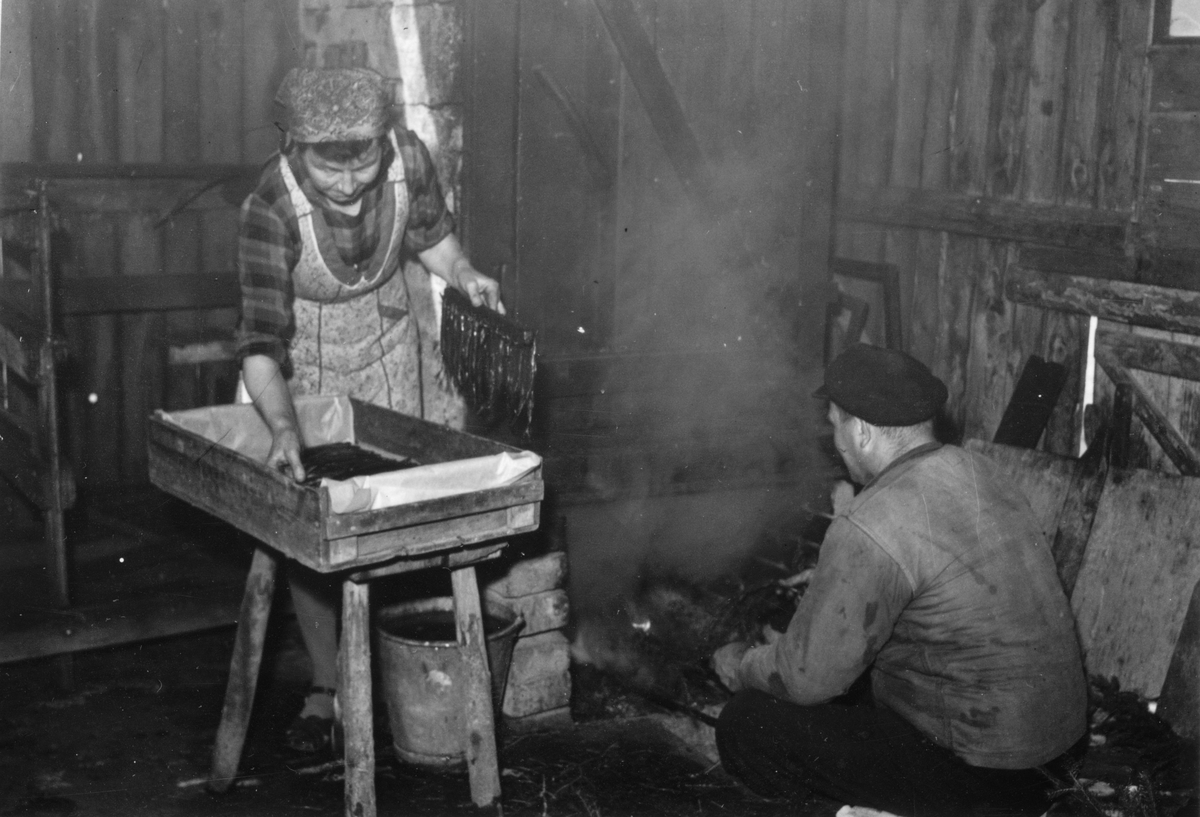 Fiskaren Edvin Wikman och hans fru Olga röker böckling.