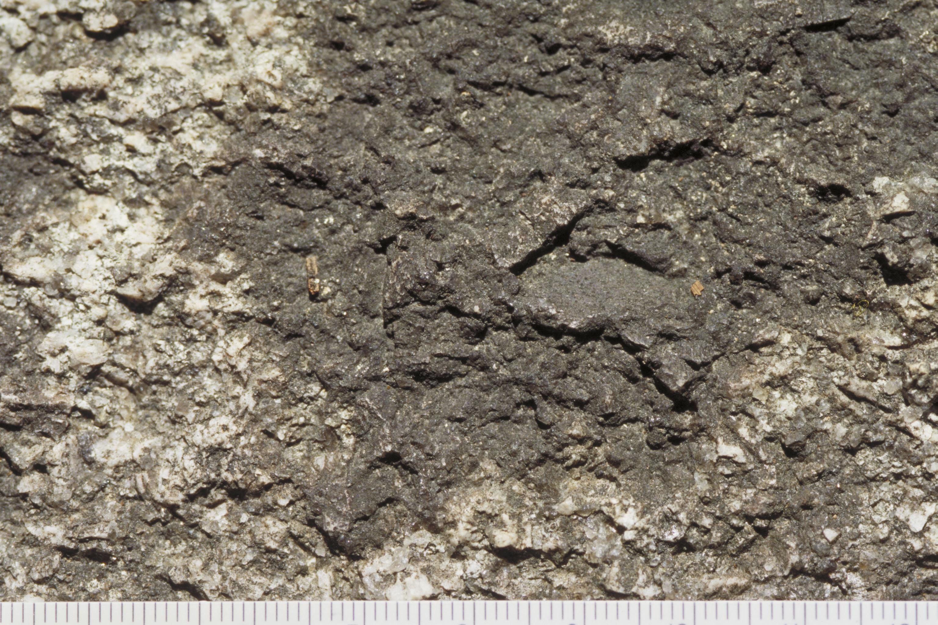 Ojämn, vittrad yta med svart beläggning, Askum 2:1.