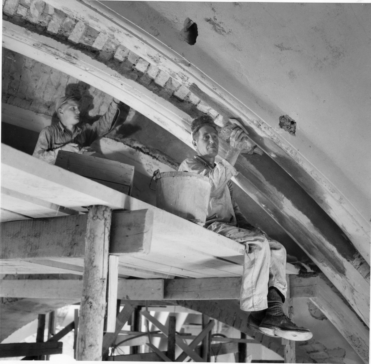 S. Söderström och R. Wahlman lagar långhusets valv.