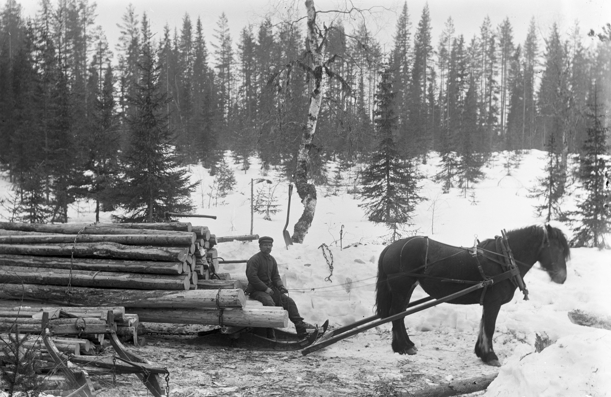 Timmerkörning med häst. Anders Persson, Stugubacken och hästen Bella