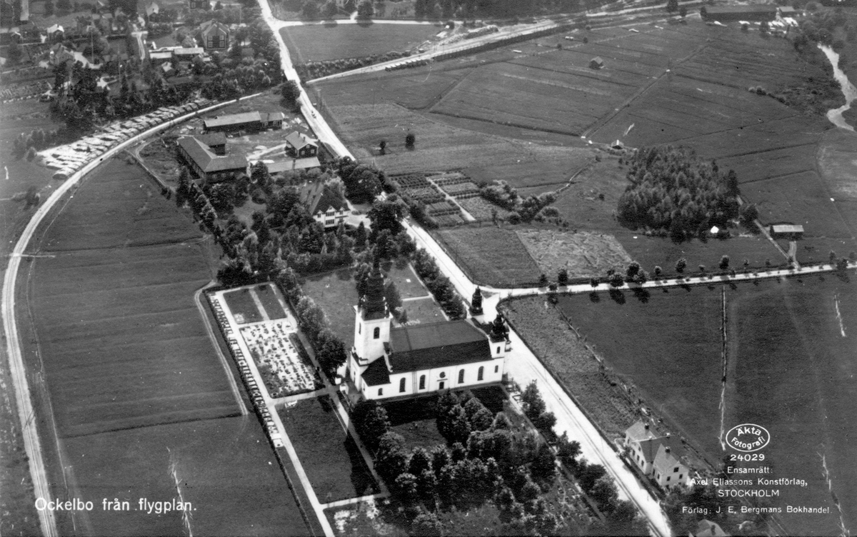 Ockelbo från flygplan. Kyrkan med prästgård och jordbruket