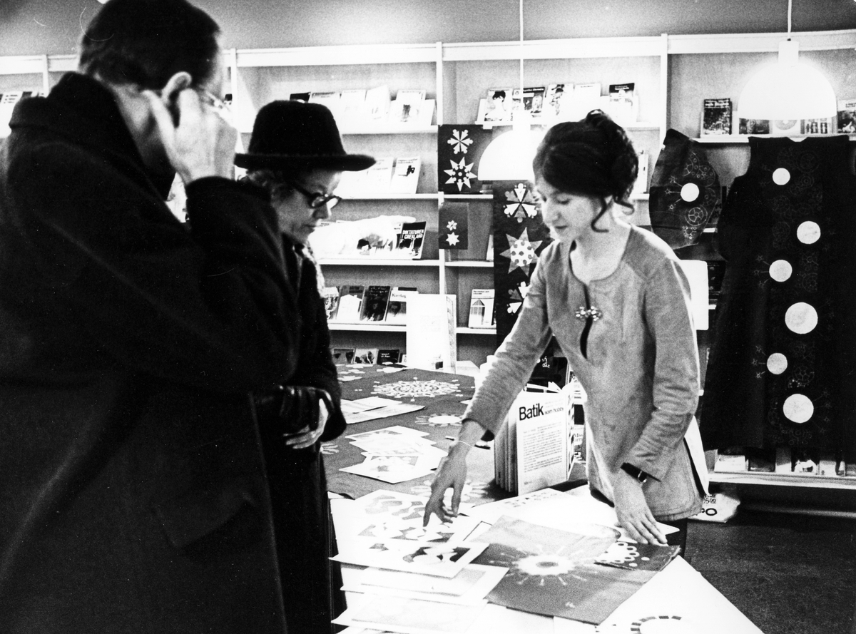 Batikutställning på Stadsbiblioteket i Gävle. ABF, bildningsverksamhet i Gävle
