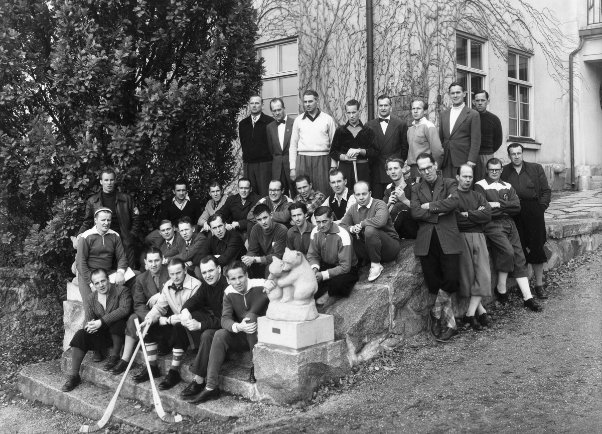 Bosön Idrottshögskola. Männen bakom björnstatyn är bröderna Gustav och Åke Nordin