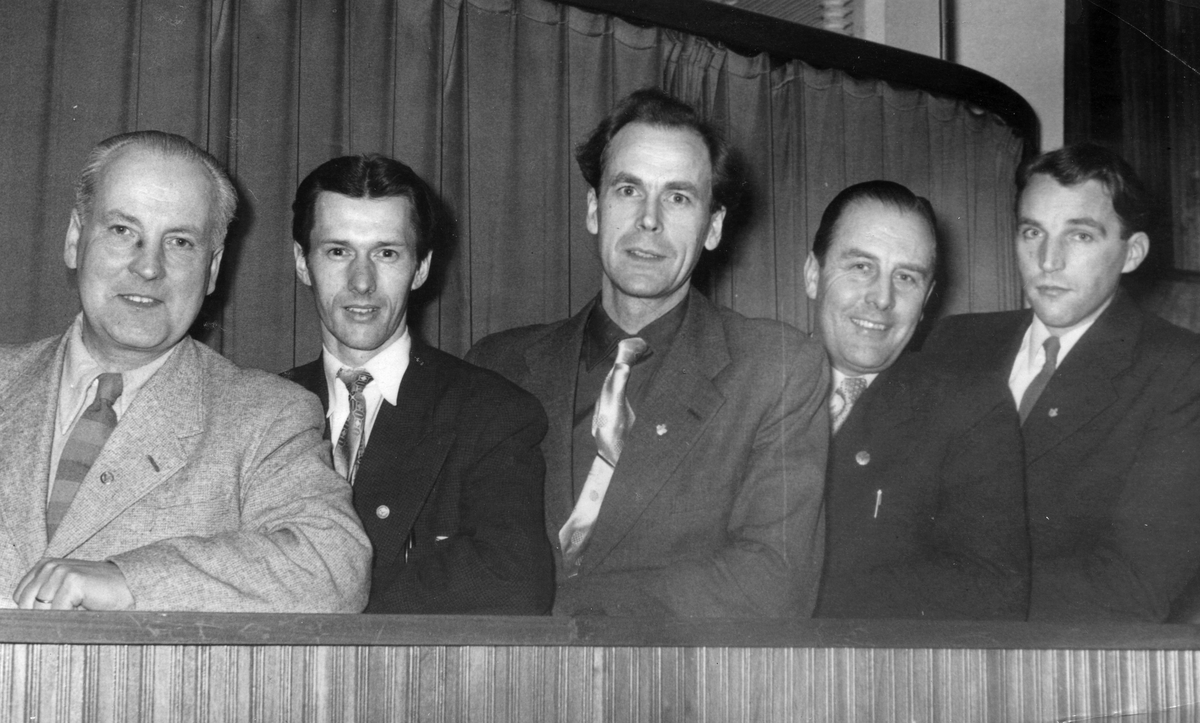 Fjärde man från höger Åke Nordin, Gävle Bandyklubb, GBK. (Baksidan av bilden stämplat "Arbetarbladet Sportredaktionen).