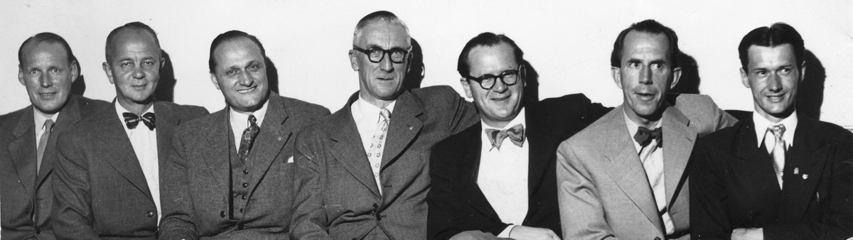Längst till höger Åke Nordin, Gävle Bandyklubb, GBK. (Baksidan av bilden stämplat "Arbetarbladet Sportredaktionen).